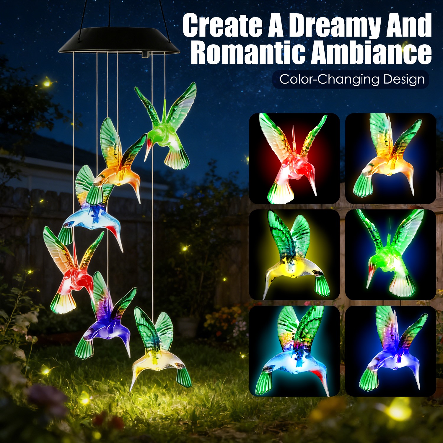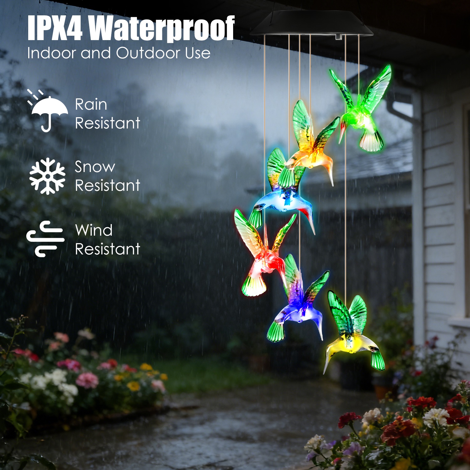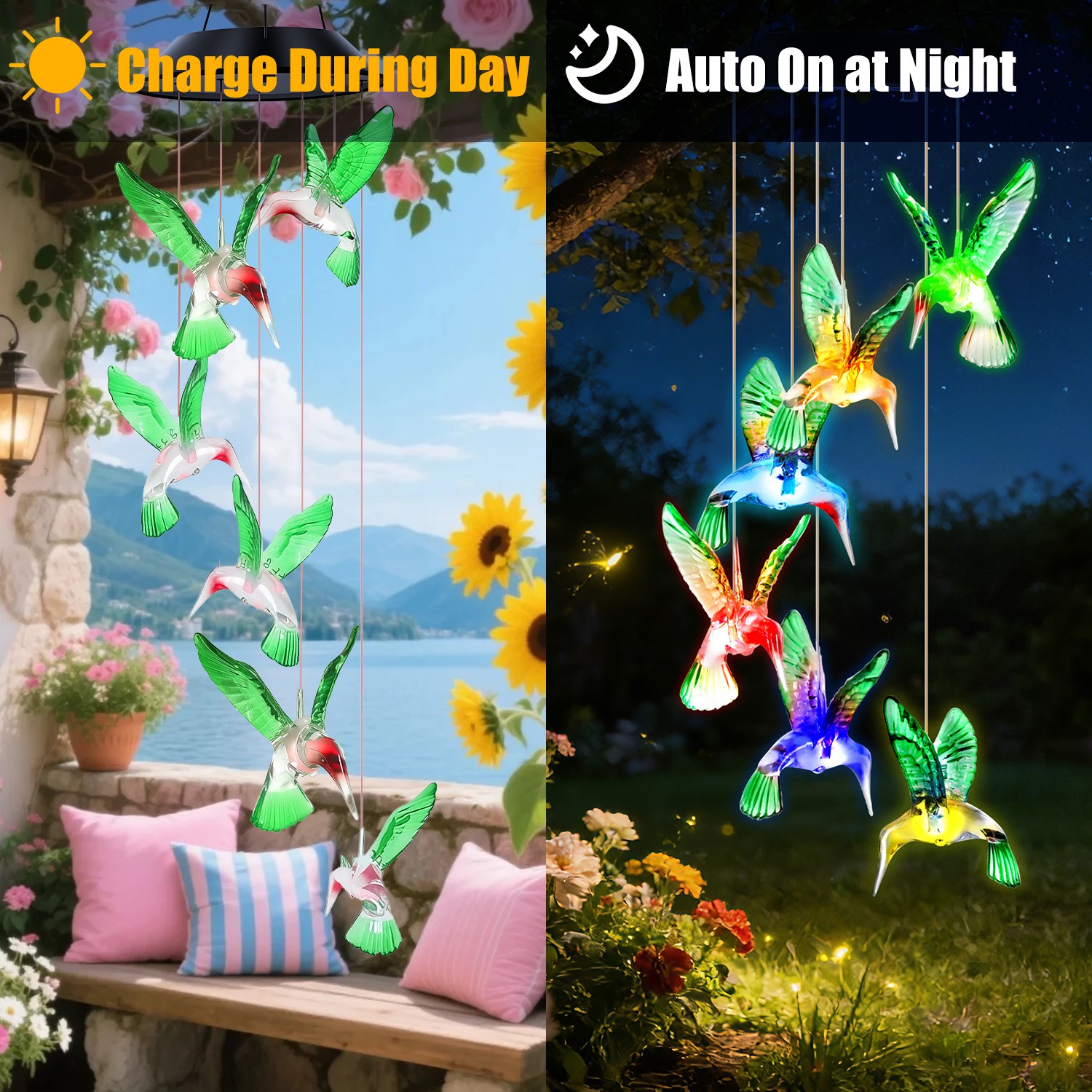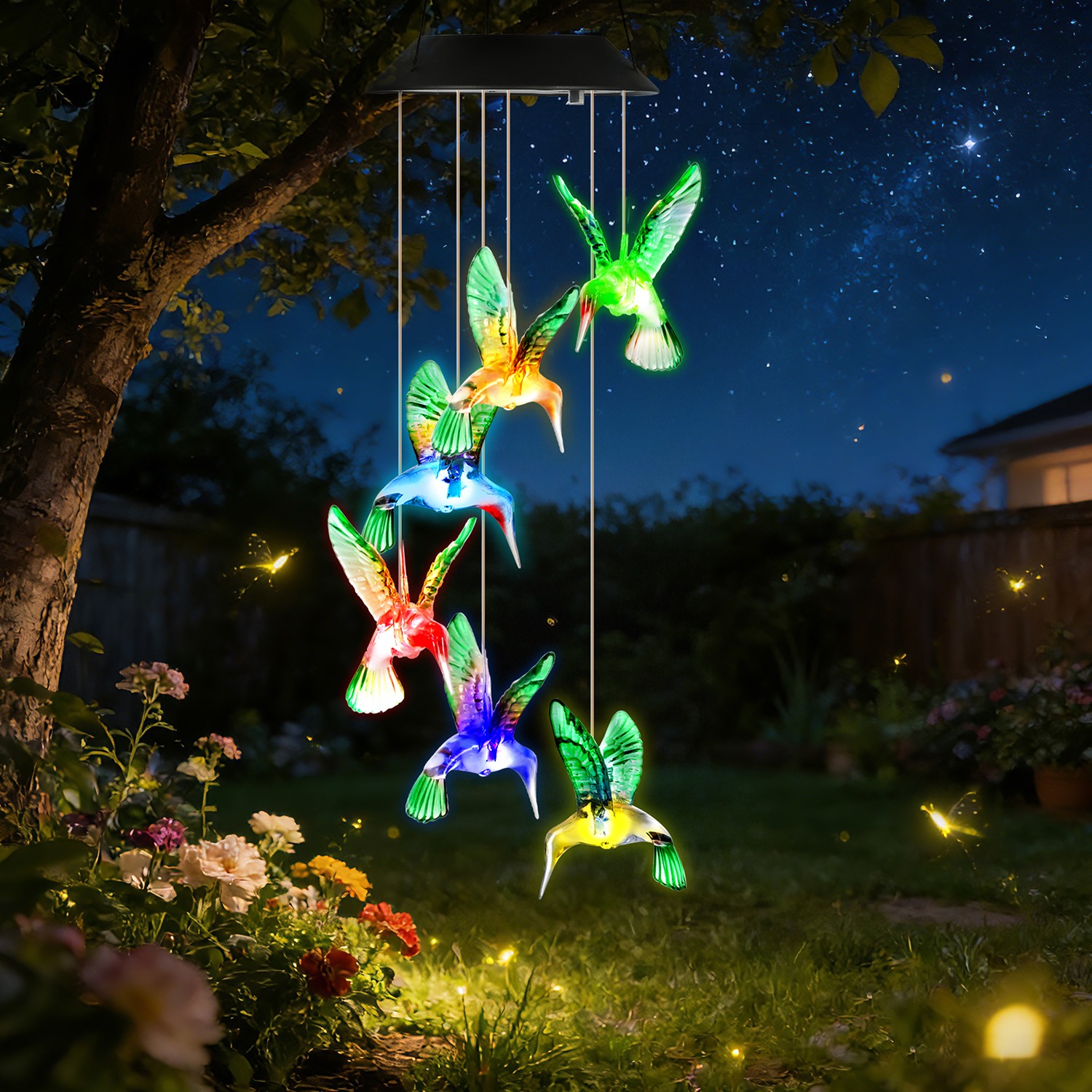 *Features*: *Soothing Hummingbird Wind Chimes*:Delicate hummingbird wind chimes gently collide in the breeze,creating soft,calming tones that bring a peaceful,nature-inspired melody to your garden,patio,balcony,or porch. *Color-Changing Solar Wind Chime Light*:Built-in 6 LED lights automatically glow at dusk,cycling through soothing color-changing hues to create a romantic,dreamy ambiance for outdoor evenings and nighttime relaxation. *Solar Powered & IPX4 Waterproof*:High-efficiency solar panel charges during the day and automatically lights up at night. Eco-friendly,energy-saving,and IPX4 waterproof to withstand rain,snow,and outdoor weather conditions. *Elegant Outdoor & Indoor Decoration*:Easy to hang. Beautiful even during the day,this hummingbird solar wind chime adds artistic charm and refined elegance to gardens,lawns,balconies,patios,windows,and home interiors. *Perfect Gift for Any Occasion*:An ideal decorative gift for Christmas,Mother’s Day,Father’s Day,birthdays,housewarmings,weddings,and special occasions—bringing beauty,light,and soothing sound to loved ones.*Specifications*: Product Type: Solar Wind Chimes Quantity Options: 1Pcs, 2Pcs Material: ABS and PVC Solar Panel: Polycrystalline Silicon Battery Type: 600 mAh Ni-MH AA rechargeable battery (included) LED Quantity: 6 LEDs LED Color: Multi-Color Changing Charging Time: Approx. 8 hours(charge directly in the sun) Working Time: Approx. 8 hours (fully charged) Waterproof Level: IPX4 Hook Size: 2.8x4cm/1.10×1.57in Per Hummingbird Size: 6.5x8cm/2.6×3.1in Solar Panel Size: 12.5×12.5×2.4cm/4.9×4.9×0.9in Per Item Size: 12.5×12.5x78cm/4.9×4.9×30.7in Per Item Weight: 150g/0.33 lbs Package Size(1Pcs): 13x13x10cm/5.12×5.12×3.94in Package Weight(1Pcs): 270g/0.60lbs Package Size(2Pcs): 26x13x10cm/10.24×5.12×3.94in Package Weight(2Pcs): 500g/1.10lbs*Package Lists*: 2x Solar Wind Chimes 2x S-shaped Hooks 1x User Manual