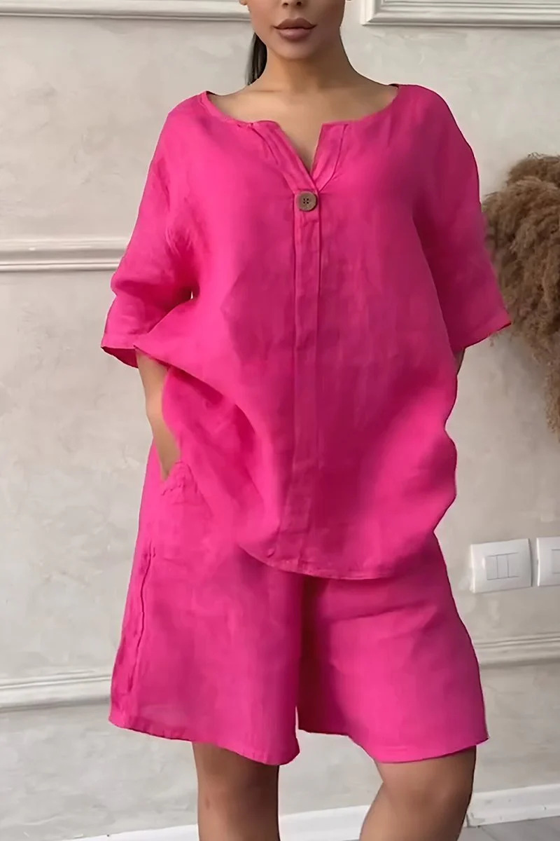 Cotton-Linen Shirt Set with High-Waisted Loose Shorts for…