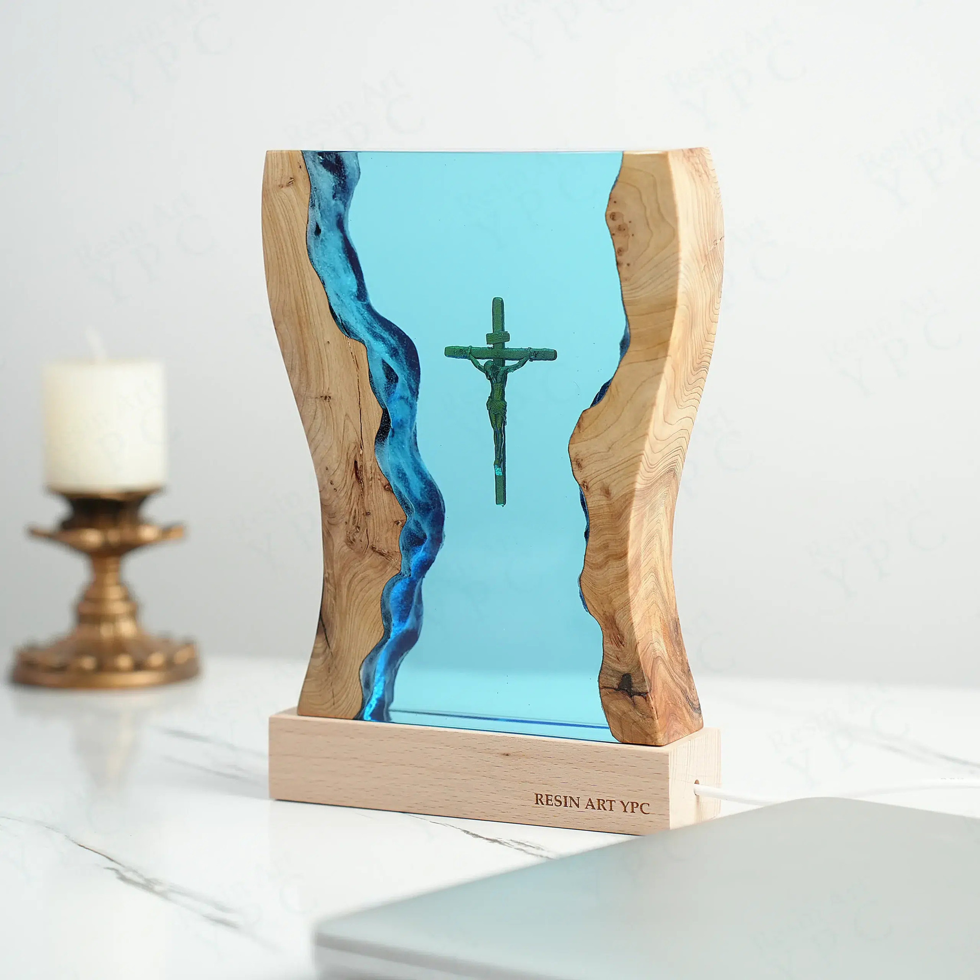 Discover this beautiful creative cross night light wooden epoxy resin desk decor, a perfect addition to your collection at Leonard & Hazel.