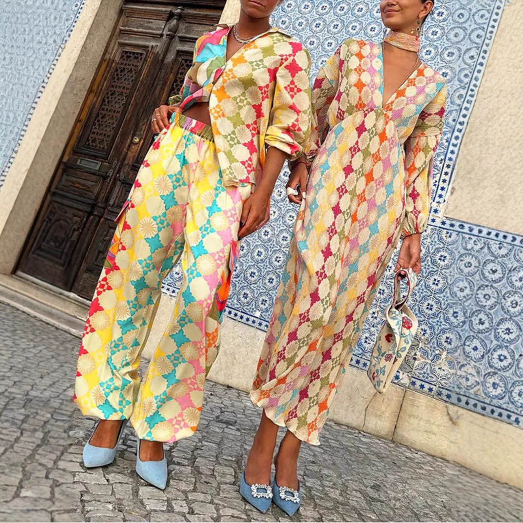 Product information:Pattern: Painted Fabric Name: Polyester Color: Pattern Color Sleeve Style: Lantern Sleeve Pants Length: Full-Length Pants Main Fabric Composition: Polyester Sizes: S, M, L, XL, XXL Applicable Gender: Women Style Type: Elegant Commuter Sleeve Length: Three-Quarter Sleeve Trendy Element: 3D/Relief Pattern Style: Commuter Style Craftsmanship: Printed